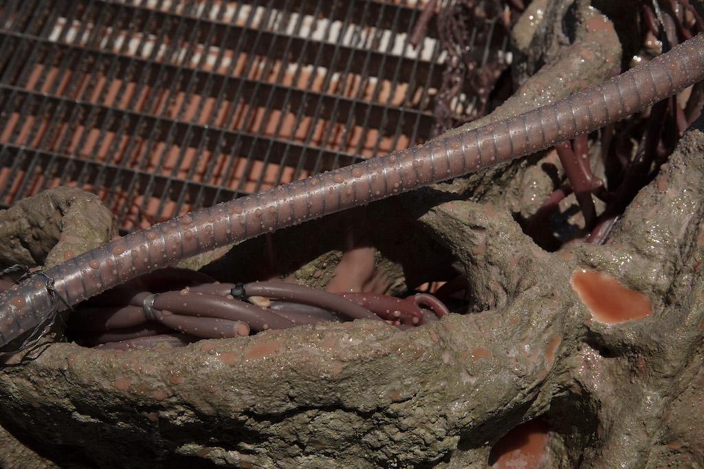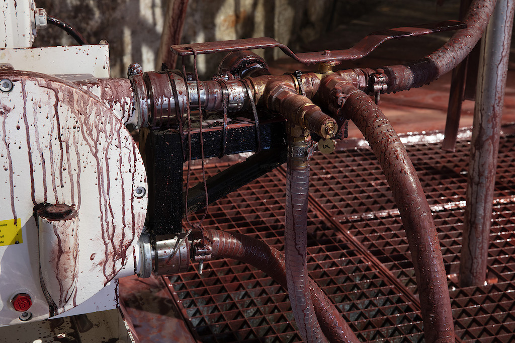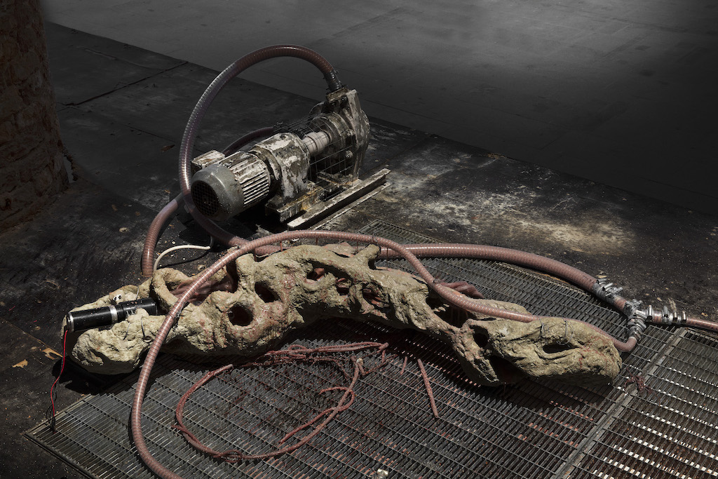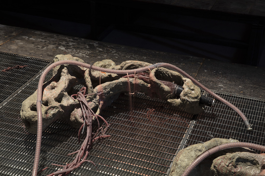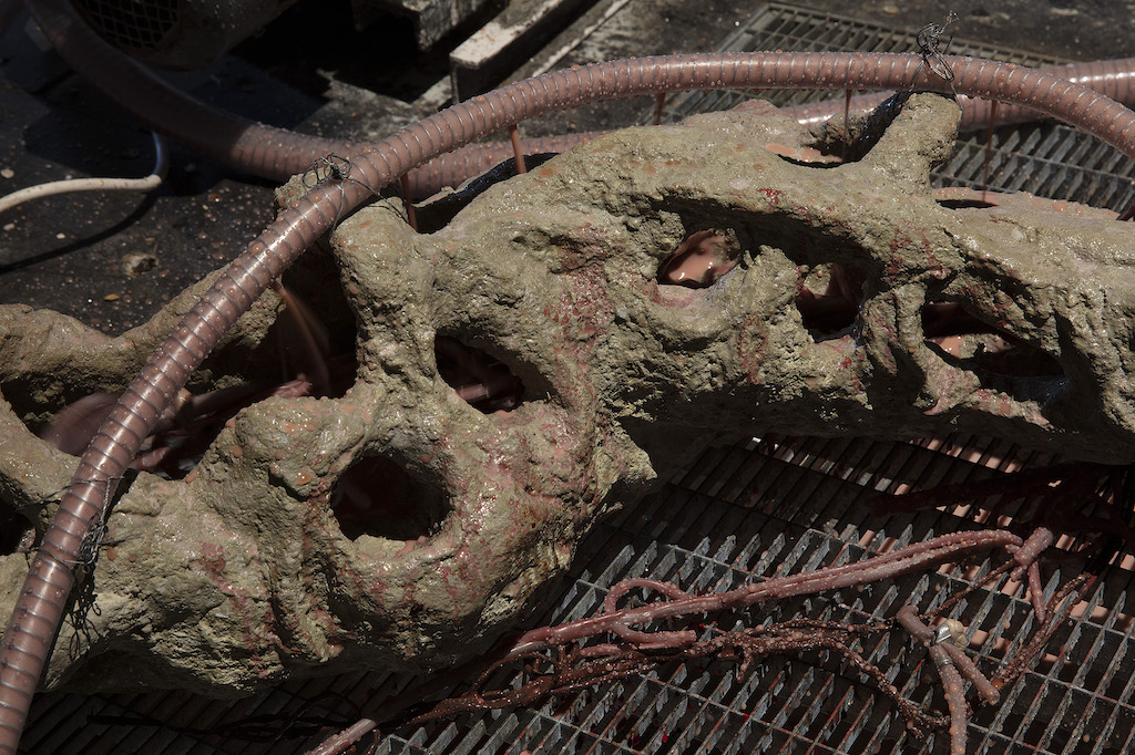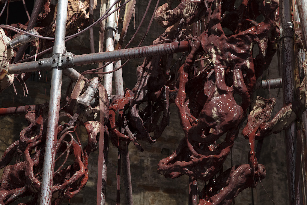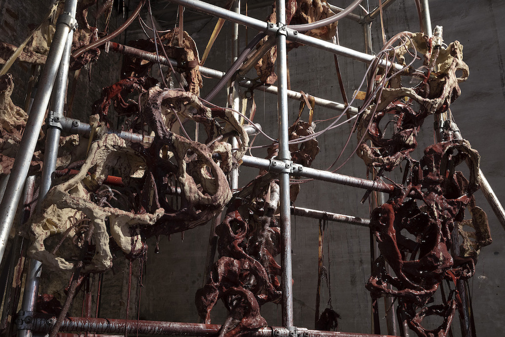 2022, Multiple ceramic sculptures on a scaffold, lithium carbonate and iron oxide glaze liquid, pump, motor and other mixed media, scaffold scale 1.8 x 2 x 4 m, dimension variable