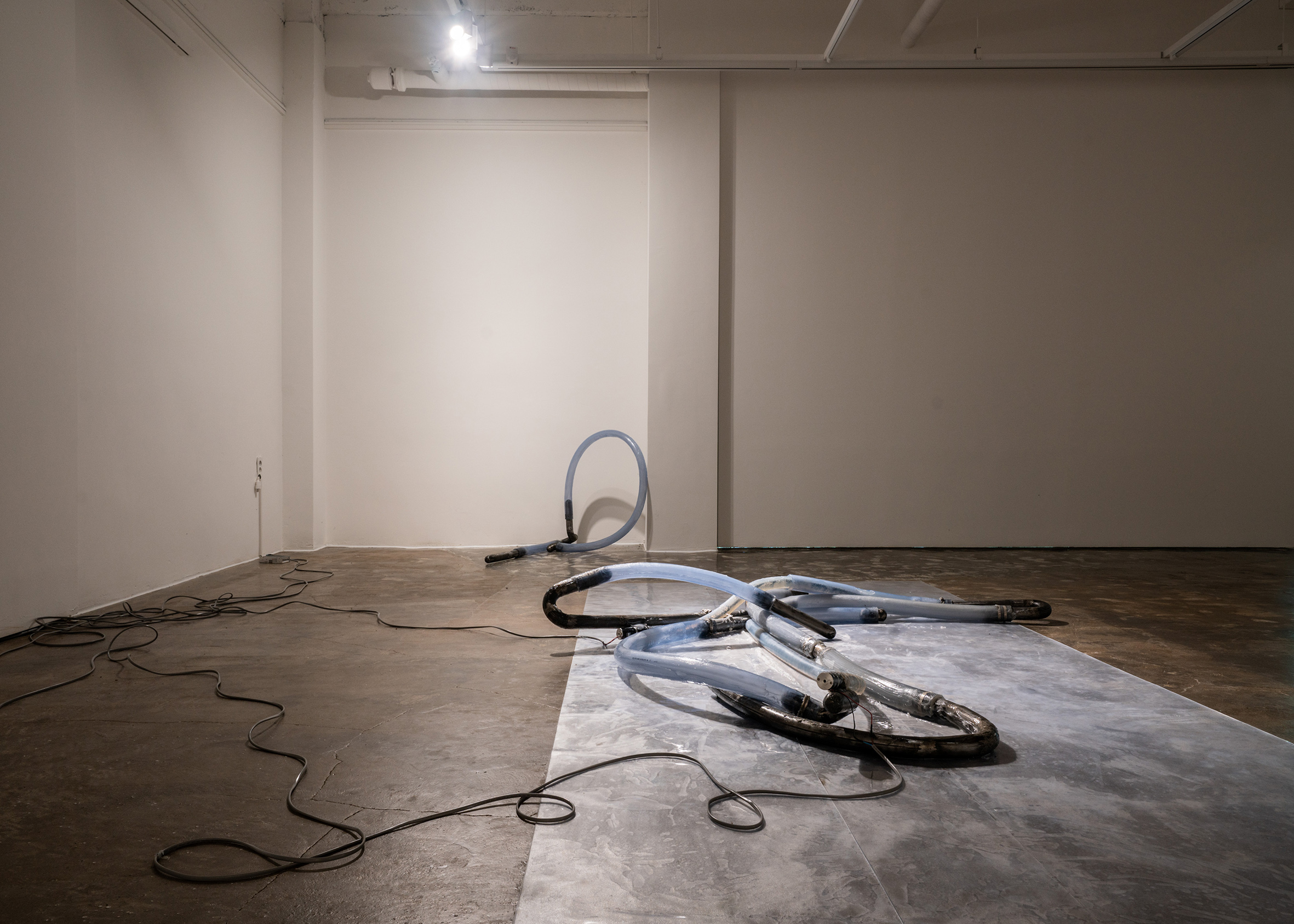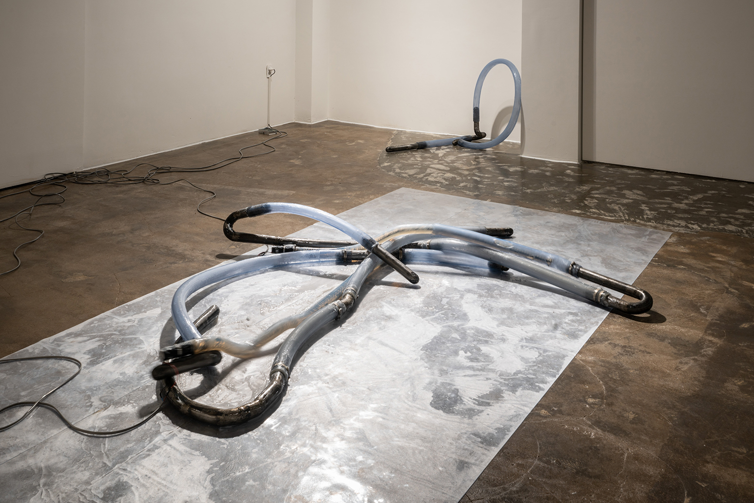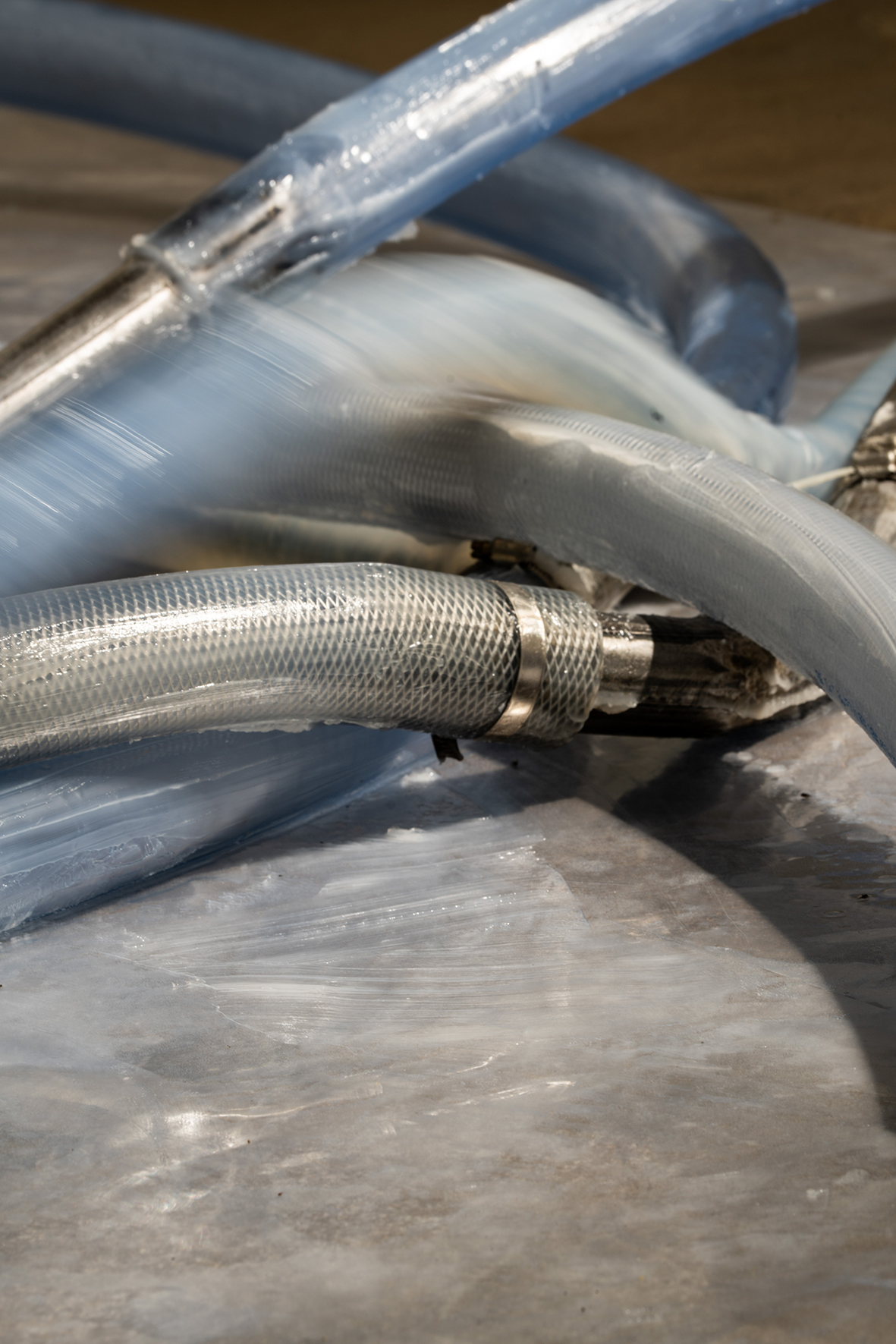 Steel, silicone, pvc hoses, grease and other mixed media, kinetic sculpture, approx. 30 x 60 x 260 cm, 2018.