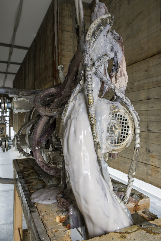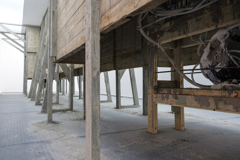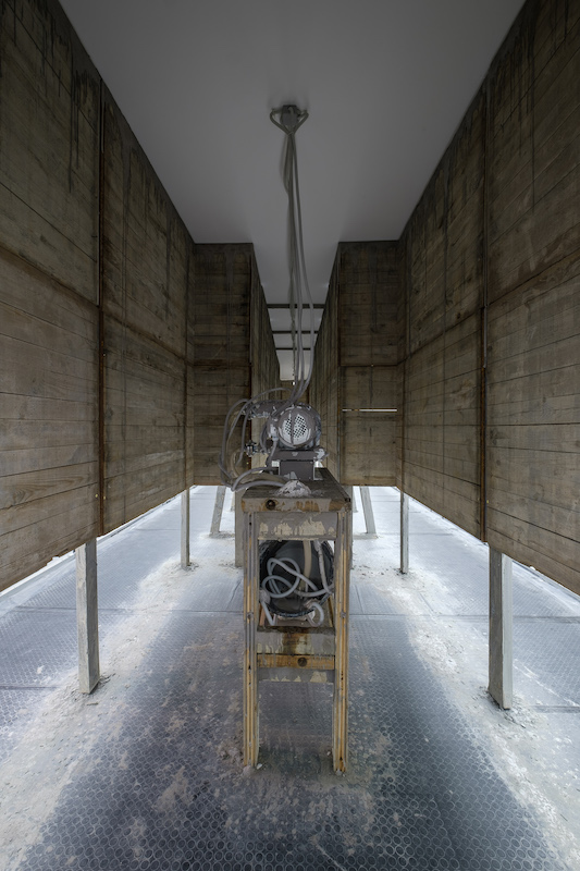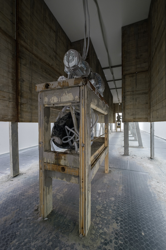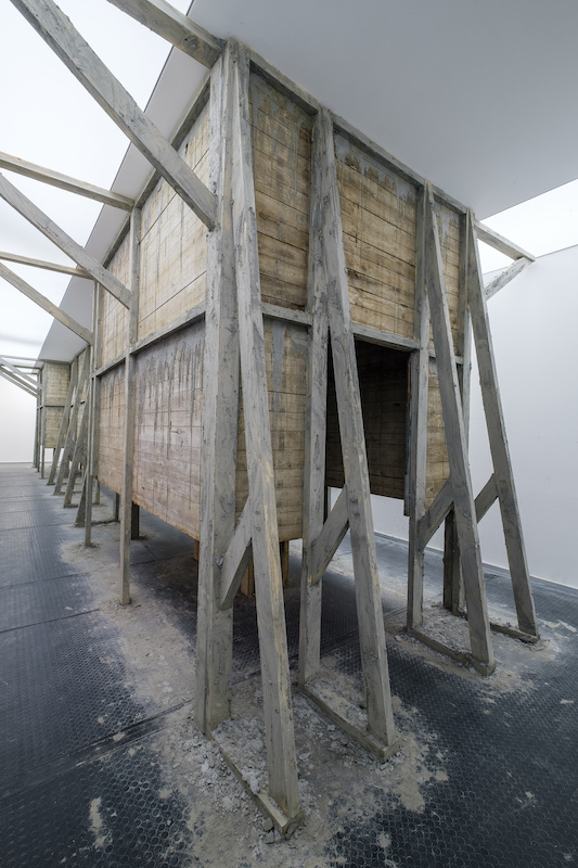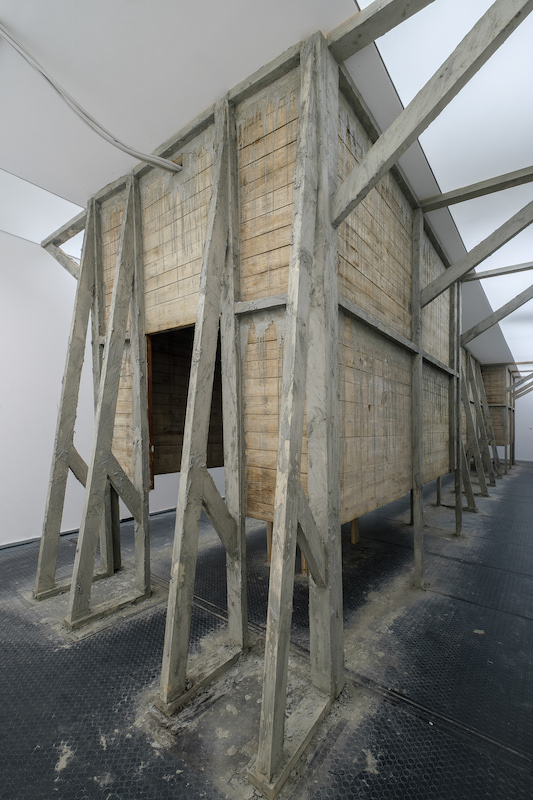 2021, used formworks, concrete, peristaltic pumps, children’s stockings, glycerin, plaster, House scale 3m tall 15m long, two pump rooms 2.5m wide, corridor in between 80cm wide, dimensions variable, commissioned by PinchukArtCentre.