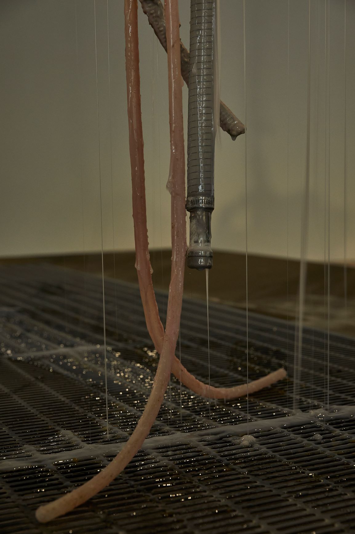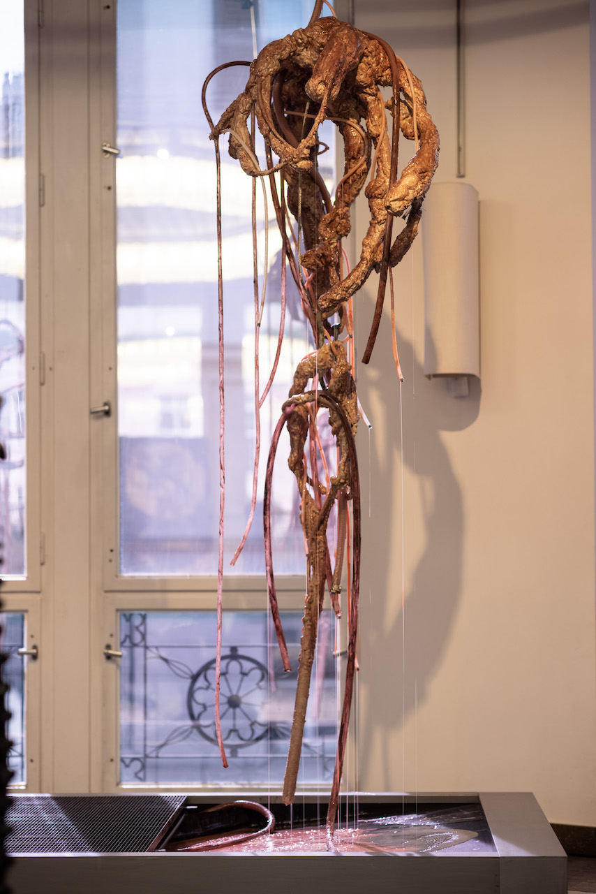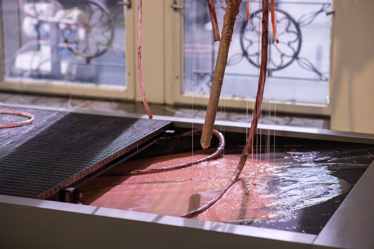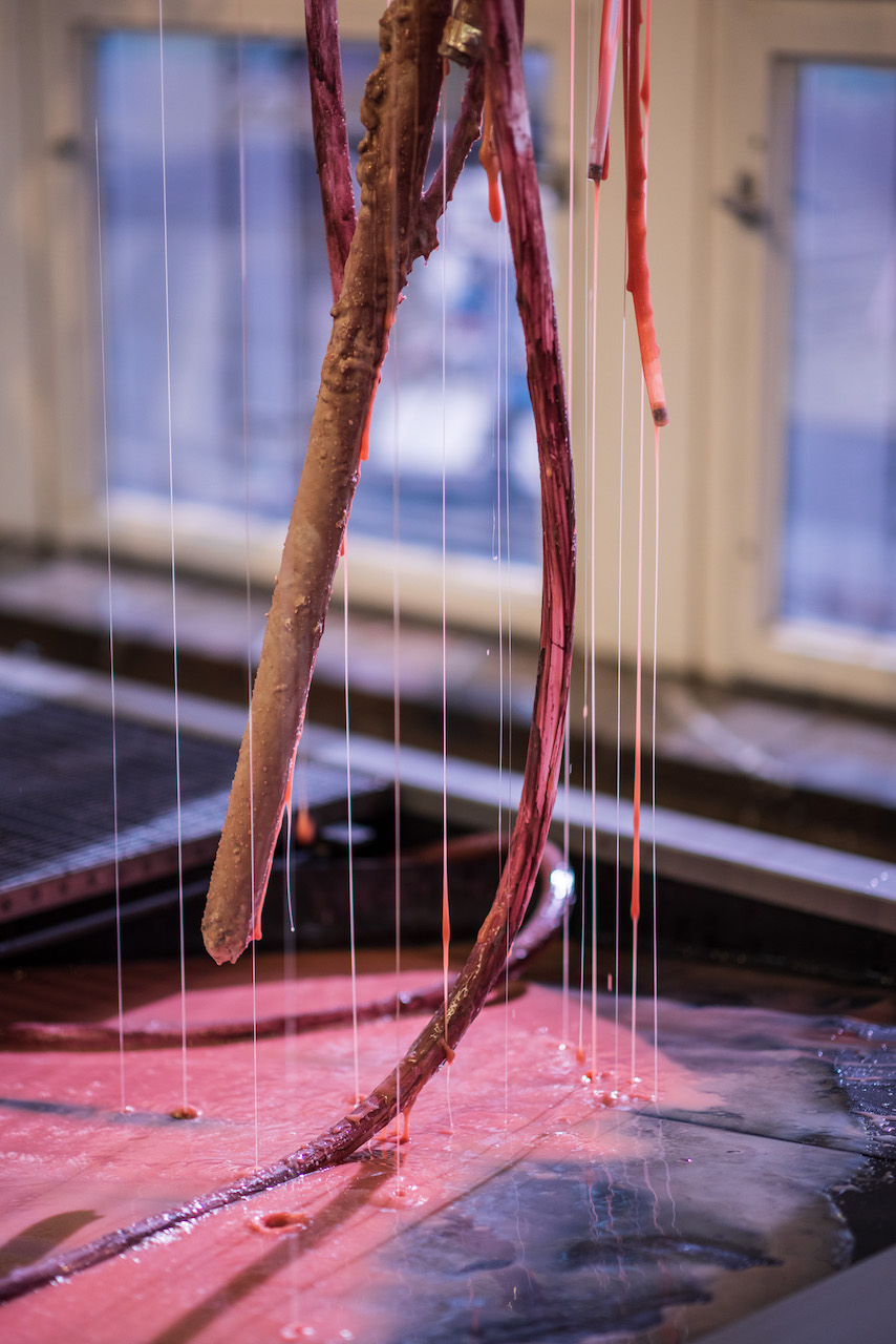 실리콘, pvc호스, 호스 펌프, 색소를 탄 글리세린, 철판에 레이저 커팅, 중고 거푸집 및 혼합 매체, 가변 설치, 긴 조각의 신장 대략 230 cm, 2020