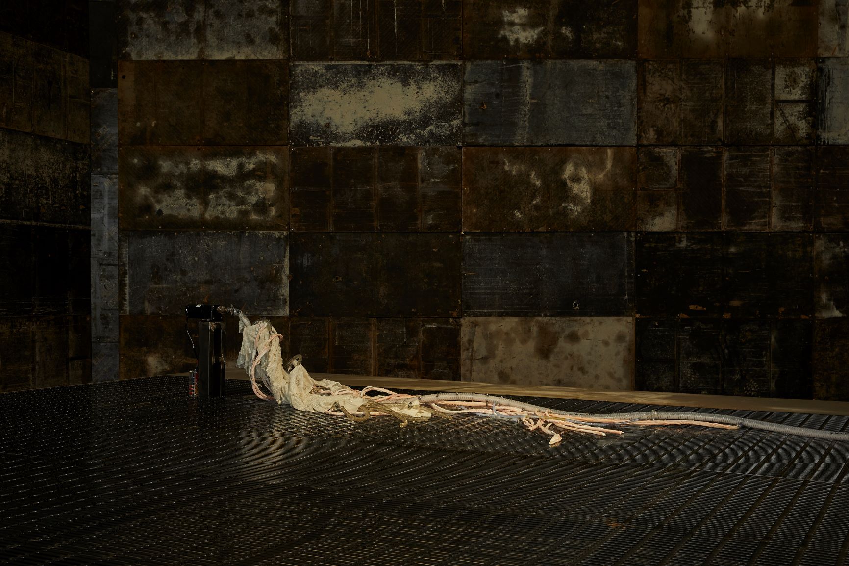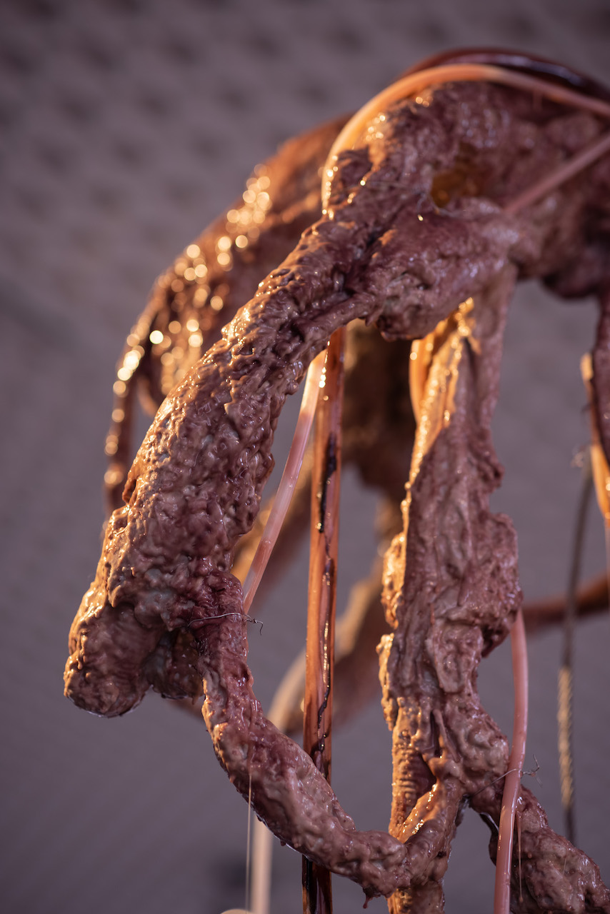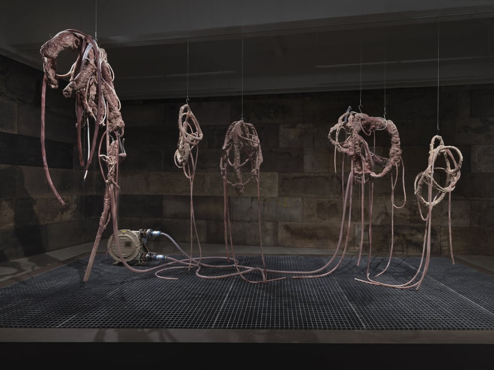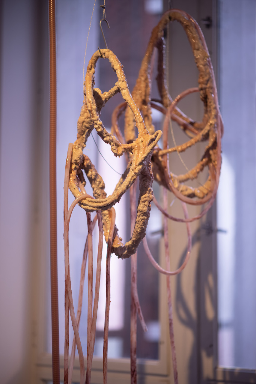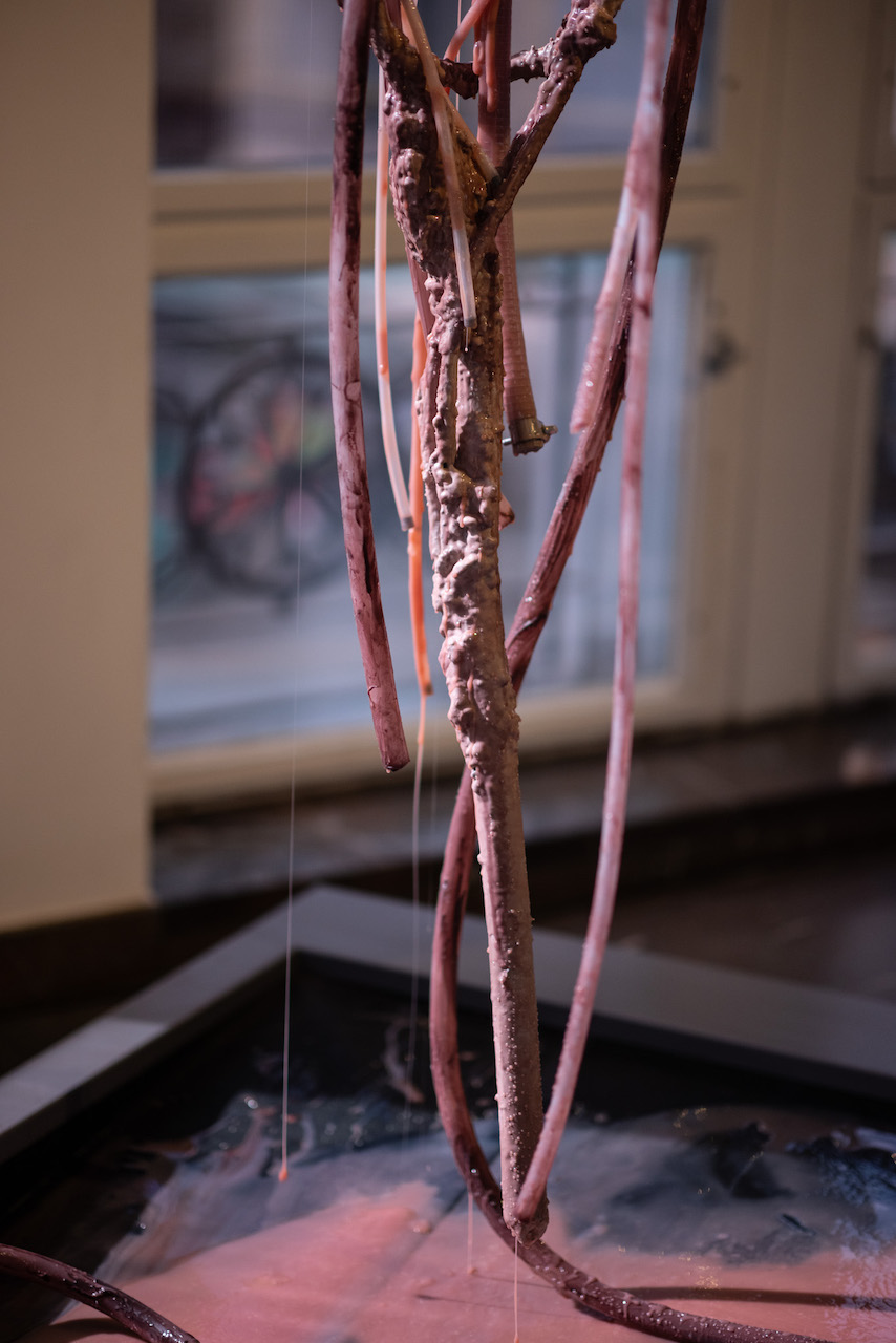 실리콘, pvc호스, 호스 펌프, 색소를 탄 글리세린, 철판에 레이저 커팅, 중고 거푸집 및 혼합 매체, 가변 설치, 긴 조각의 신장 대략 230 cm, 2020